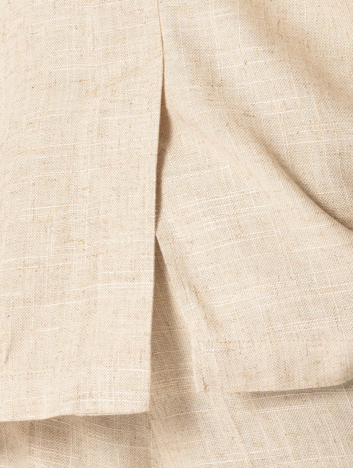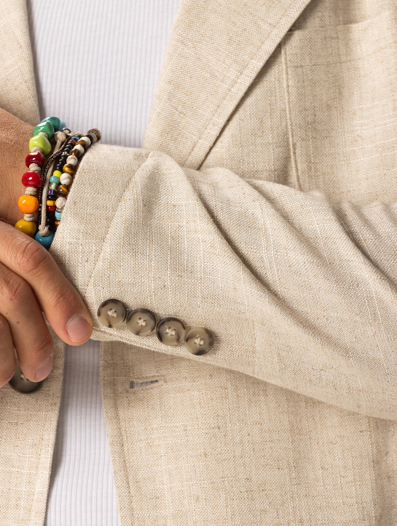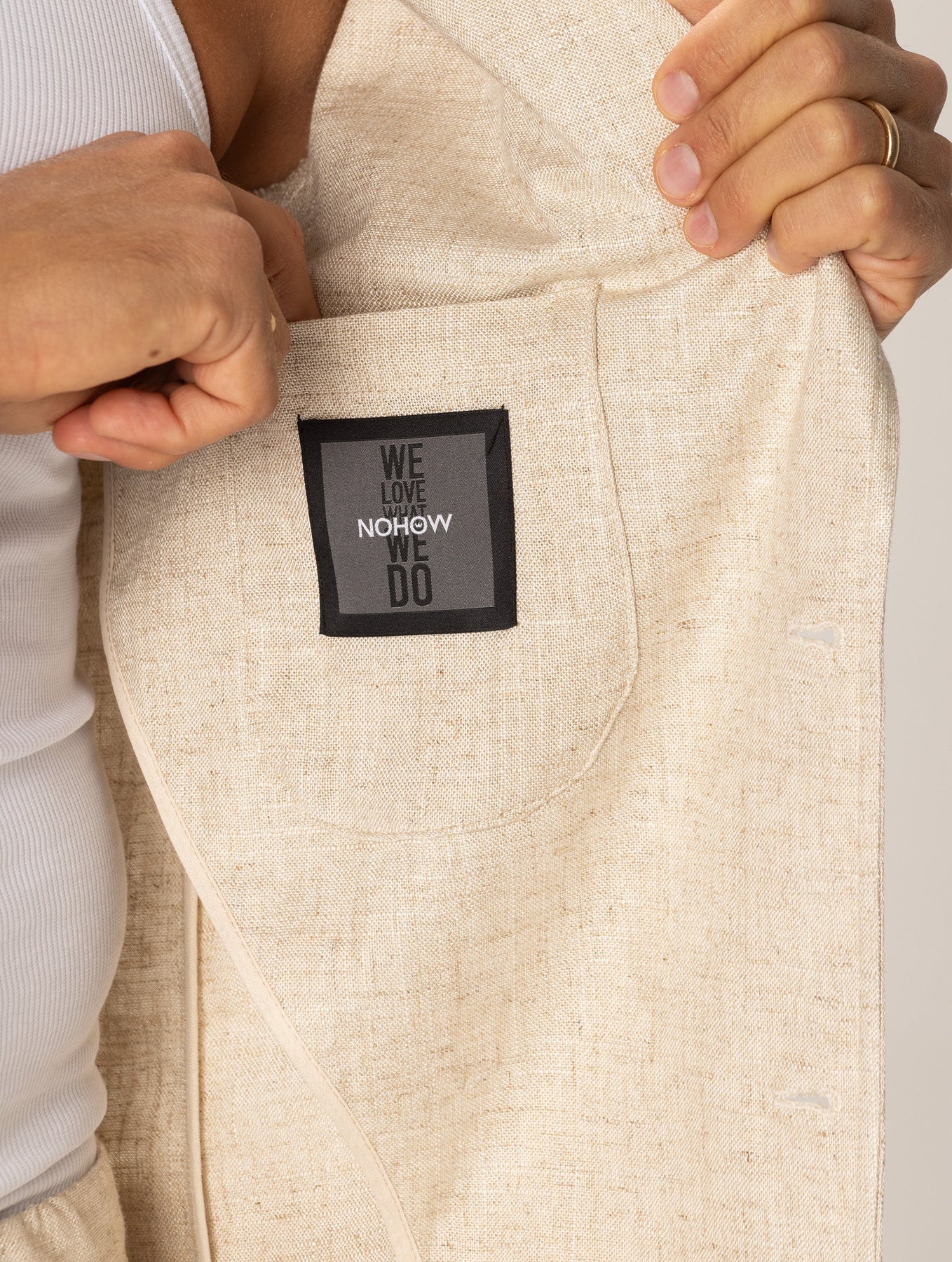 Deze beige blazer straalt tijdloze elegantie en verfijning uit. Het lichte, soepele linnen volgt soepel de lijnen van het lichaam en voelt comfortabel aan. “Mooi in combinatie met een chino of lichte broek.”